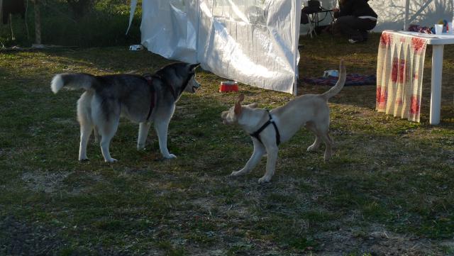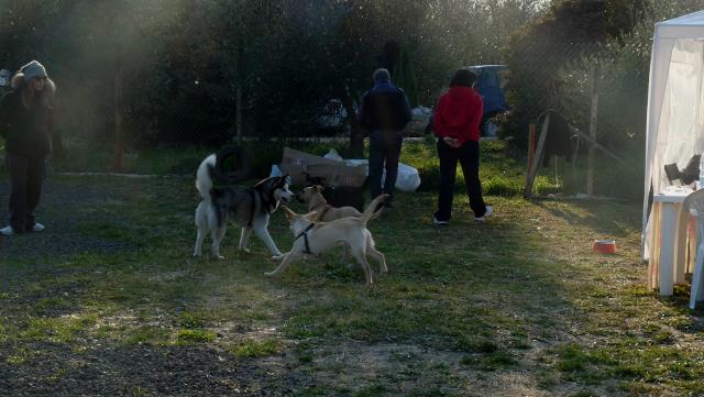 4. socializzazione con un cane adulto regolatore – nella socializzazione di ieri è stato introdotto un cane adulto, Naima, l'husky della nostra collega Francesca, che ci ha dato l'opportunità di mostrare come i cani adulti possano insegnare ai cuccioli il “galateo”del gioco e dall'approccio ad altri cani. Spesso i cuccioli giocano tra loro in maniera un po' troppo vivace e le corse diventano sfrenate e troppo eccitanti, in queste situazioni quando una persona inesperta decide di interrompere il gioco di solito richiama il cane con tono perentorio oppure va a prenderlo e lo tiene fermo. Naima, invece, ha scelto di mettersi a giocare con gli altri e tra tutti si è relazionata soprattutto con Rocco che tra tutti è quello più vivace. Con Rocco Naima ha iniziato a correre, poi ha rallentato ed ha iniziato a sbarragli la strada quando si muoveva troppo velocemente finché Rocco non si è fermato. Poi ha fatto la lotta con lui utilizzando esattamente le sue stesse “tecniche” per entrare in sintonia con lui e piano piano lo ha condotto alla calma, tanto che Rocco ha deciso di mettersi giù e immobilizzarsi finché Naima non gli ha dato il permesso per riprendere a giocare. Durante una delle fasi di gioco-lotta fra Naima e Rocco, Blu ha deciso che voleva giocare con loro e si è avvicinato, allora Naima ha mostrato i denti per tenerlo lontano, lui ha fatto un altro tentativo per attirare la sua attenzione abbaiando e lei di nuovo ha mostrato i denti, finché Blu ha capito che non era il momento né il modo e si è allontanato.