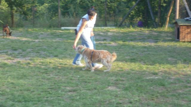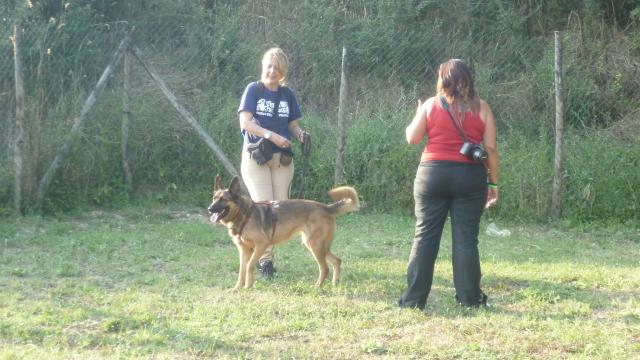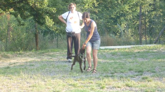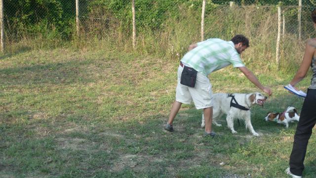 Mentre preparavamo i percorsi finali i cani si sono concessi una breve pausa per bere e riposarsi al fresco, poi di nuovo tutti in campo per verificare quanto appreso in questa giornata al guinzaglio e riprovare qualcosa del laboratorio di pratica sulla Rally Obedience. Ogni binomio ha percorso ciascuno dei due circuiti che comprendevano: camminata al piede, cambi di lato in diverse modalità, stop&go, salti, barriere a terra, resta con distrazione, richiamo al piede, cambi di direzione.