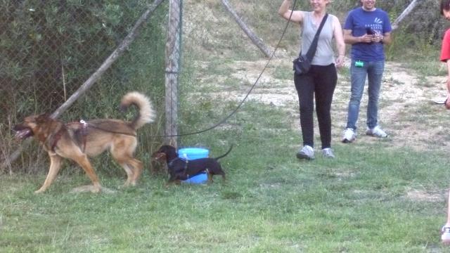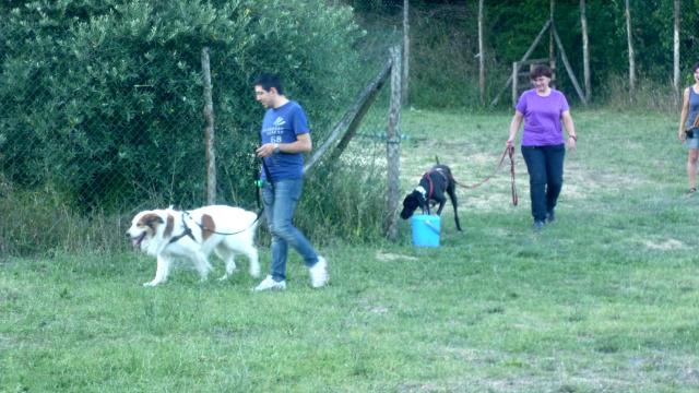 A questo punto escono Mabrouk, Dea, Mila, Jenny e Fuffo e tutti gli altri tornano al guinzaglio per accogliere Margot. Camminiamo tutti in circolo in modo che Margot possa mettersi dietro ed incontrare un cane alla volta, scegliendo liberamente se e quanto avvicinarsi. Decide di annusare Oliver, un vero lord, che accetta con calma l'ispezione. Liberati tutti i cani dal guinzaglio continuiamo a camminare con l'accortezza di lasciare che sia Margot a decidere se avvicinarsi o meno a qualcuno.