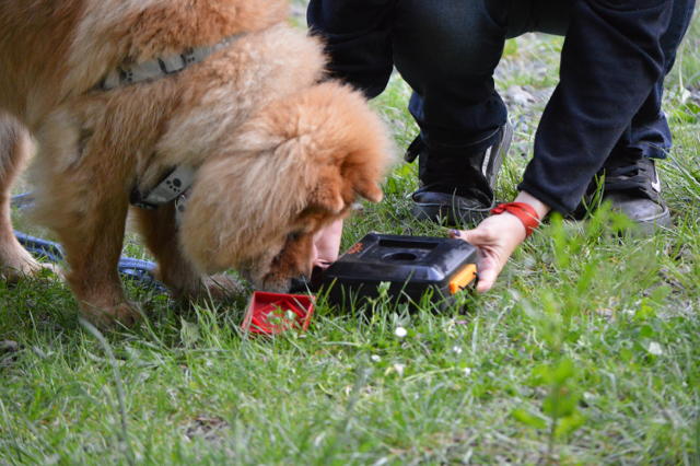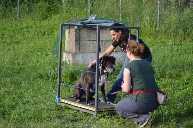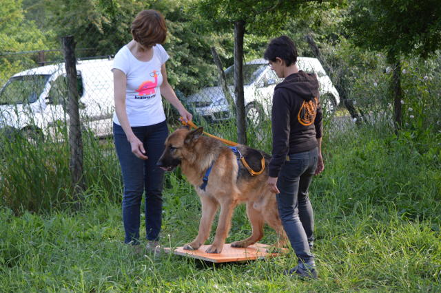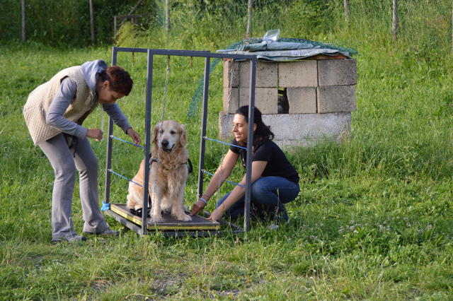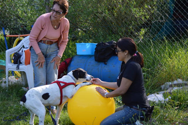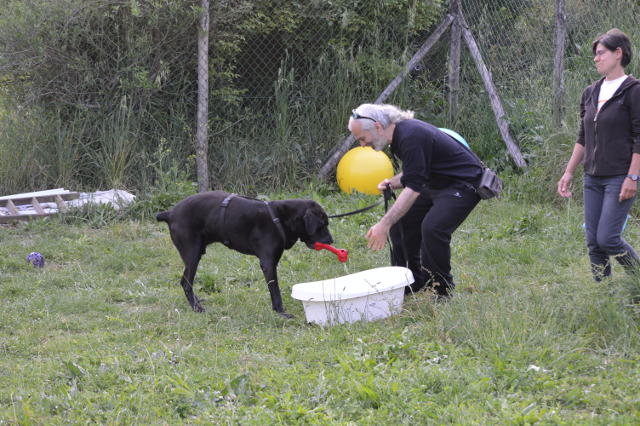 parte pratica - i cani hanno sperimentato come modificare la postura e gestire l'assetto su piani variamente mobili, allenando così la propriocezione e l'equilibrio su una tavola basculante, sull'altalena e su un pallone gonfiabile. Hanno allenato la coordinazione scavalcando piccoli ostacoli in spazi ristretti e la loro capacità di concentrazione e problem solving con tanti giochi diversi. Spunti interessanti sono venuti anche dalla proposta di recuperare oggetti in acqua, alcuni cani hanno risposto con entusiasmo e altri hanno dovuto affrontare una grande difficoltà. E' stata dedicata una stazione anche allo stretching per favorire la flessibilità e mobilità articolare.