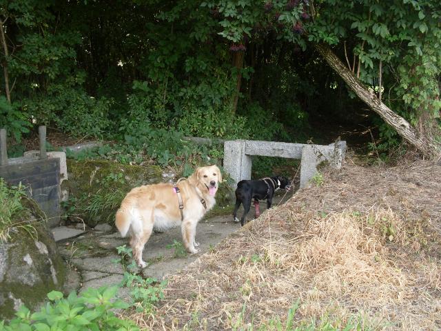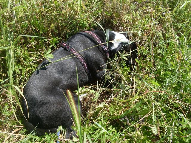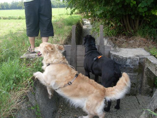 Primo giorno di vacanza attraversiamo il paese di passo spedito (su ogni pezzettino di prato un cartello "vietato far salire i cani" ci costringeva a trattenere la pipì fino a un luogo più adatto) per dirigerci verso i boschi, finalmente ci lasciamo il paese alle spalle e ce ne andiamo liberi per campi e boschi, troviamo sentieri ombreggiati, ostacoli improvvisi, lunghi canali in mezzo a prati assolati finché non decidiamo di fare una sosta ristoratrice.