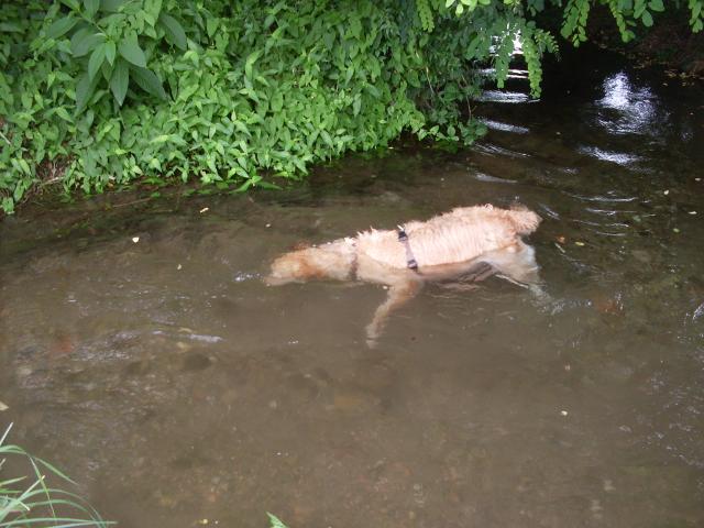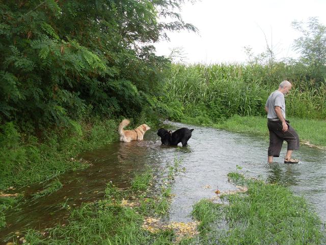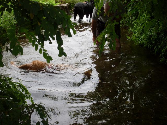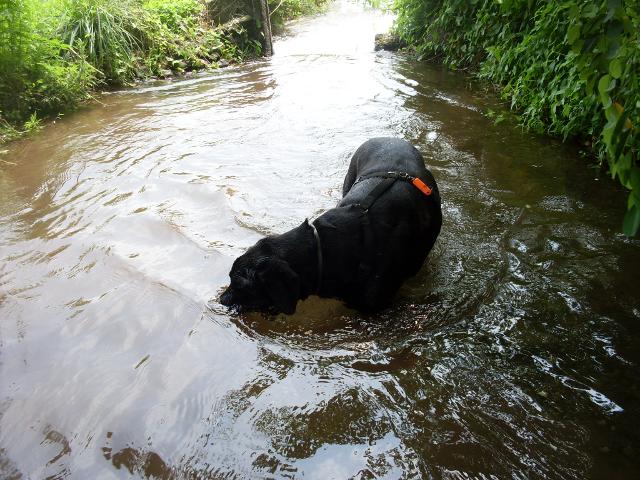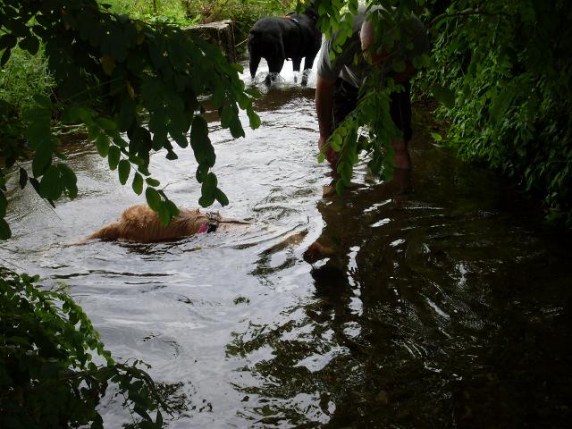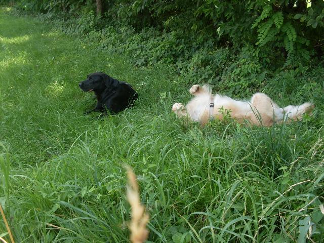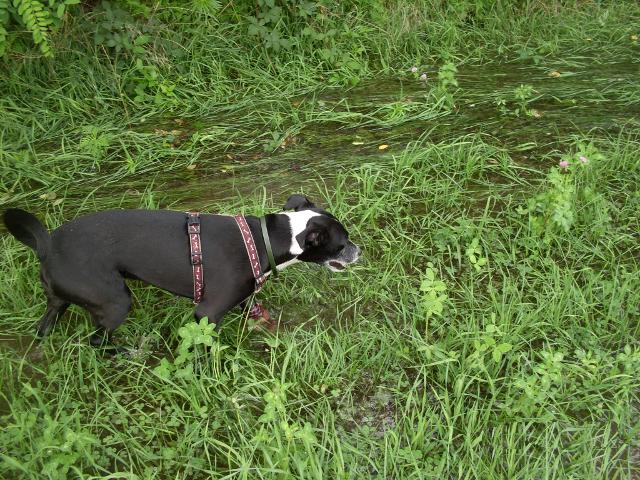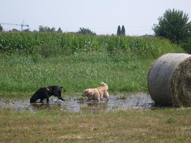 Scegliamo un nuovo percorso in mezzo ai campi, in cerca di un posto dove anche Macchia, che non ama l'acqua, possa rinfrescarsi un po'. Buck e Zoe si lanciano in una grande pozza ma Macchia non gradisce … andiamo oltre e finalmente anche lei fa il bagno, mentre Buck invita l'amica bionda a giocare.